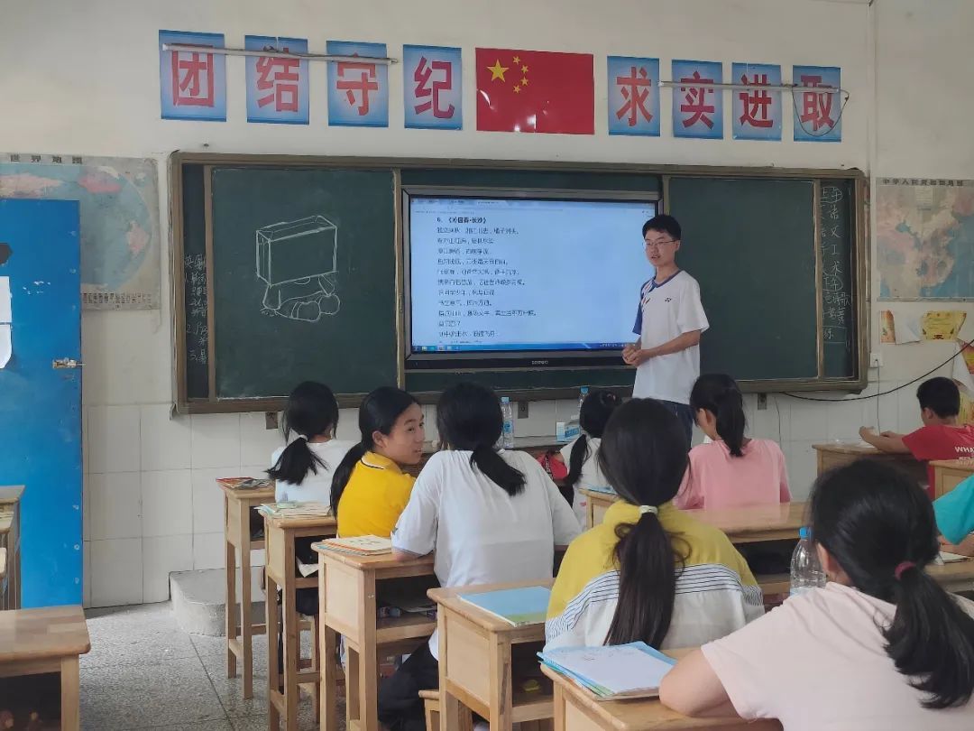 “腹有诗书气自华”,优美的传统诗词是滋养少年志气的最佳养料。为加深小朋友们对经典诗词的学习与理解,志愿团成员们带领大家吟诵毛泽东的《沁园春·长沙》和《沁园春·雪》,细细品味经典红色诗词的精神意蕴。起初,当支教老师胡维琛把这两阙词展示出来时,小朋友们纷纷表示“老师,我们看不懂”。支教老师从诵读着手,一词一句引导同学们逐步理解这两阙词。“独立寒秋,湘江北去,橘子洲头……”,老师念一句,学生读一句,悦耳的读书声回荡在夏日的校园。诵读完成后,老师们又带着小朋友们配乐朗诵。抑扬顿挫中,词中的无限豪迈渐渐在小朋友们的心中生根发芽,古典诗词以它独特的魅力滋养着小小少年们立志笃行。