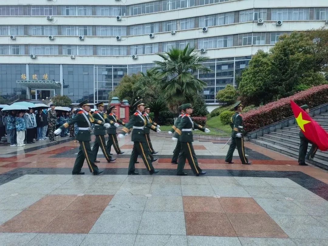 首先,由国旗班成员宣布此次升旗仪式正式开始,全体保持肃立。当嘹亮的国歌声响起时,旗手们奋力挥动左臂,在国旗抛向天空的那一瞬间,所有的同学都不约而同地抬起头,全神贯注地凝视着国旗。在小雨夹着微风中,五星红旗冉冉升起。