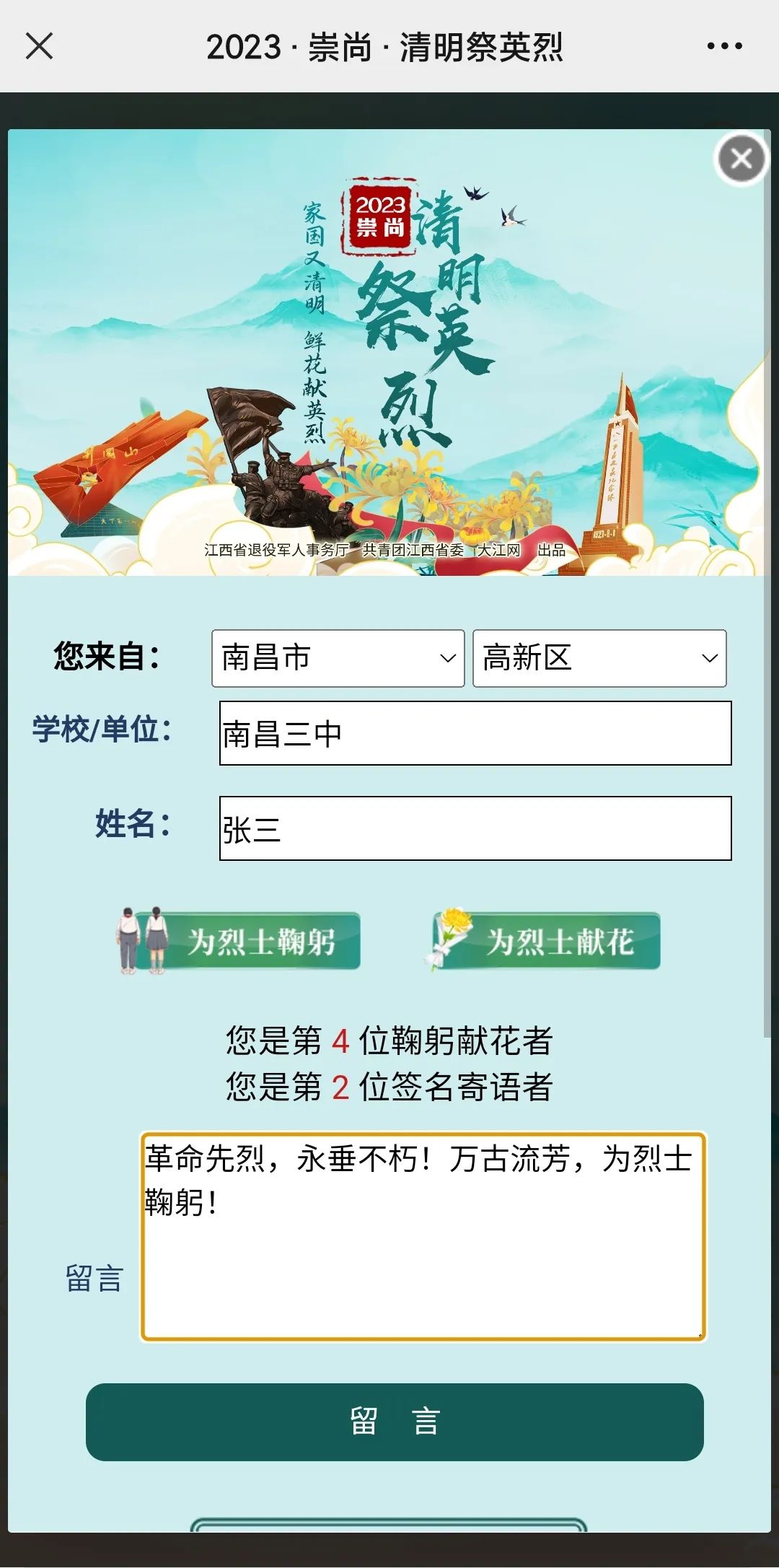 一、 关注“大江网”微信公众号,点击聊天框发送“祭英烈”获取活动参与方式;