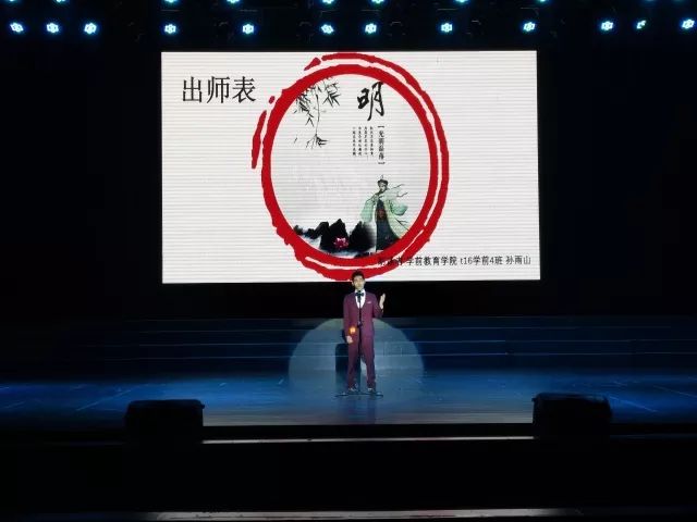 中华上下五千年,沿着甲骨文苍桑的纹理,驾驭历史的长车,政法学院杨文靓带来的《读中国》让我们感受到中华民族厚重的历史。今当远离,临表涕零,不知所言,是诸葛亮的谏言。我们熟知的《出师表》由学前教育学院孙雨山带来,再次在我们耳畔回响。