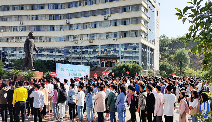 校园环境卫生是一个学校文明程度的重要标志,也是影响学校对外形象的直观因素。开展生活垃圾分类减量,自觉爱护校园环境卫生,是实现学校绿色发展的需要。为创建文明美丽校园,以优美的环境迎接教育部本科教学工作合格评估,10月31日中午,我校在毛泽东铜像广场举行“垃圾分类减量从我做起,文明校园因你美丽”主题活动启动仪式。校党委委员、副校长刘卫林,校团委书记刘德平出席仪式,校学生会全体成员、各二级学院学生分会主席、各班班长、团支部书记共计500多人参加了启动仪式。校团委办公室负责人朱婧主持仪式。