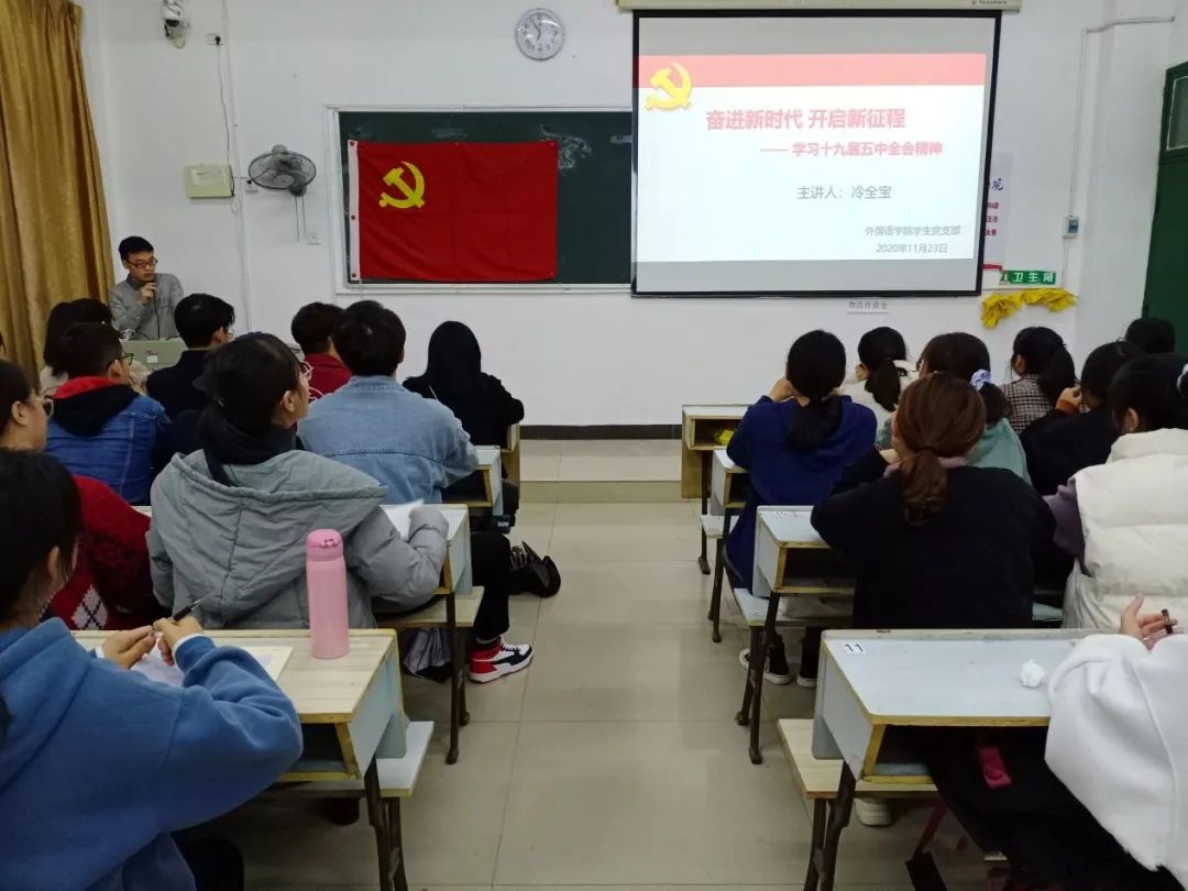 为深入学习宣传贯彻党的十九届五中全会精神,外国语学院于2020年11月23日19:00在英华楼3302开展十九届五中全会宣讲活动,参加此次活动的人员有外国语学院17级辅导员冷全宝、团总支学生分会全体成员及全体入党积极分子。