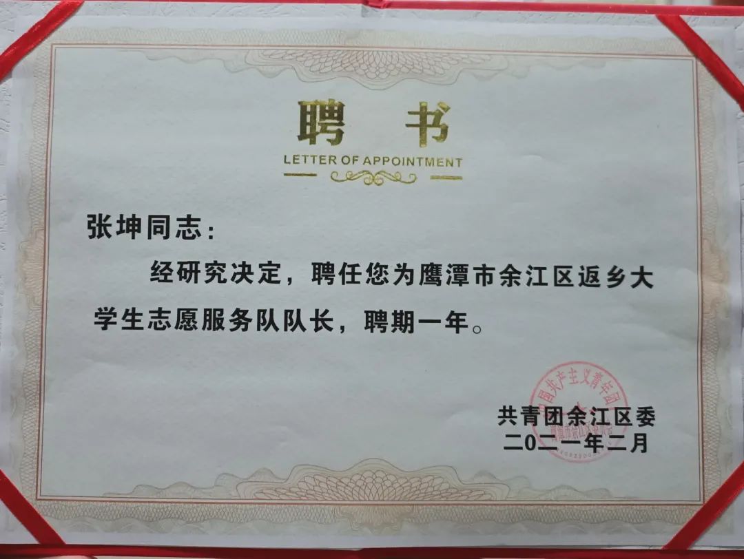 萍乡学院工程与管理学院19工造(国际)二班的张坤同学,寒假期间看到鹰潭团市委发出的招募疫情防控青年志愿者的通知便主动联系了家乡团区委,并提议建立一支由青年学子组成的志愿服务队,发挥团员青年的先锋模范作用,这项提议得到了家乡团区委的支持和肯定,于是他们组成了鹰潭地区第一支返乡大学生志愿服务队,在家乡团区委的统筹安排和积极协调下,返乡大学生志愿服务队与人民医院顺利进行了对接,并且从1月30日开始坚守在余江区人民医院疫情防控的志愿服务岗位上,他工作认真仔细 ,受到家乡团委和人民医院的一致好评,成为了家乡疫情防控不可或缺的一支青春力量。