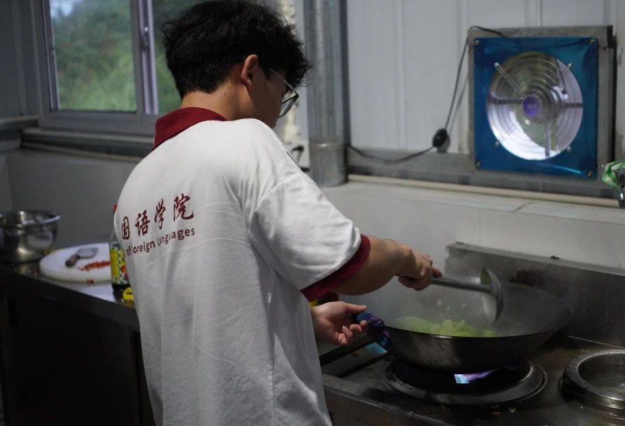 暮色缓缓笼罩小村,雨势渐弱,厨房成了满是烟火气的温馨天地。老师与同学们各展厨艺,择菜的同学专注分拣,切配成员将土豆切成均匀细丝、把黄瓜拍打成适口块状,掌勺者则娴熟地起锅热油、调味翻炒。不久,清爽的清炒时蔬、酸辣的凉拌黄瓜与鲜香的紫菜蛋花汤等相继出锅,丰盛菜肴摆满餐桌。大家围坐而食,欢声笑语伴着饭菜香气在村庄里飘散。这场充满烟火气的协作,不仅凝聚了团队情谊,更承载着初到乡村的温暖与期待,为后续支教、助农、村志撰写等实践任务积蓄力量,让青春在乡村振兴的征程中绽放独特光彩。