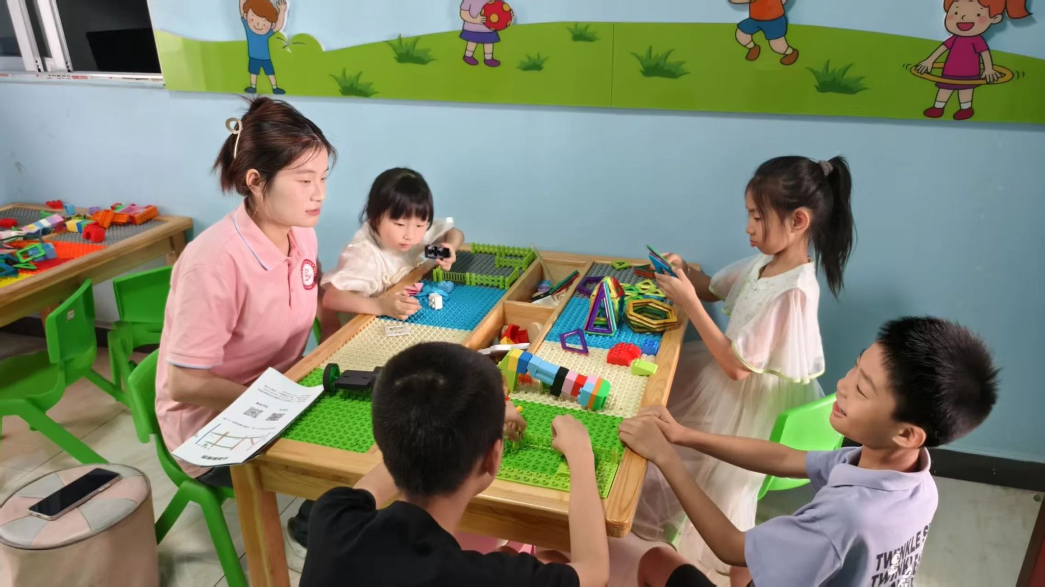 课间休息时分,志愿者们与孩子们的互动满是温馨。在积木桌旁,志愿者们专注陪伴,和孩子们一起摆弄彩色积木,在搭建中分享创意与快乐;另一处,志愿者们温柔环抱着孩子,和两个小女孩围在一起,专注于手中的折纸,轻声交流步骤,让课间时光充盈着温暖与童趣,成为志愿服务里闪闪发光的片段。