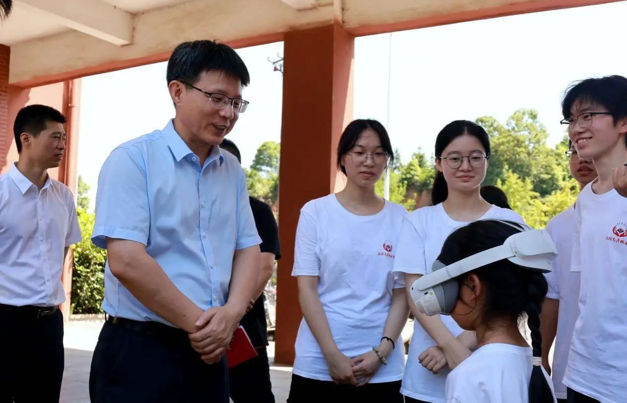 随后,刘林芽一行前往经开区福田镇硖石社区,看望慰问信息与计算机工程学院“VR云游安源红”基层推广实践队。刘林芽走入实践活动中间,与硖石社区的居民一同体验VR眼镜3D畅游萍乡红色文化地标,并和实践团成员亲切交流,与大家进行了座谈交流。刘林芽强调,“三下乡”是送科技、文化、卫生下乡,信息与计算机工程学院此次实践内容将红色文化与现代科技完美融合,为乡村文化振兴注入了新的活力,意义非凡,形式新颖。他勉励全体实践队员要以此为契机,深入了解基层现状,用实际行动展现当代青年在中国式现代化进程中挺膺担当的风采。