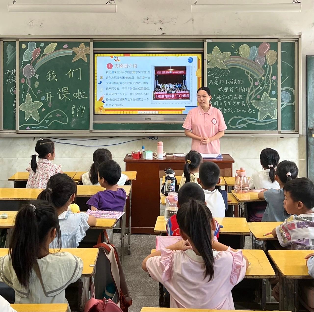 首先,开班仪式在温盘小学的教室举行,现场气氛热烈。学生们在志愿服务团成员的引导下有序入座。志愿服务团代表谭涵予、龚彩玉在仪式上发表简短而有力的讲话,介绍团队的组成和支教活动的目标,强调教育对于孩子们成长的重要性。