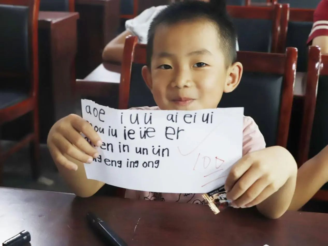 拼音学习闯关环节趣味盎然。志愿者宋羽希、肖章婷巧妙将声母、韵母编成朗朗上口的儿歌,带着孩子们用“听发音—大声跟读—手势比划”三步法沉浸式学习:孩子们手举拼音卡片,专注模仿老师的口型反复练习发音;随后进行声韵母书写,在规范拼写中加深记忆。课后,志愿者针对孩子们“平翘舌不分”“前后鼻音混淆”等常见问题,通过示范口型、对比练习等方式进行一对一指导,巩固正确发音方法,让每个孩子都能精准掌握发音技巧。