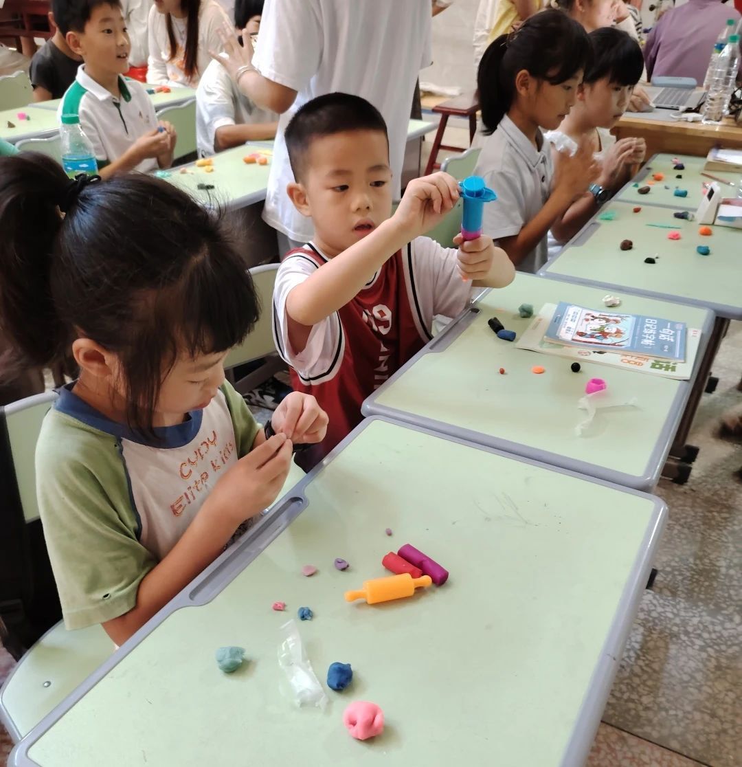 理论学习结束后,志愿者们将彩泥和模具一一分发到孩子们手中,并鼓励大家大胆创作。拿到材料的孩子们瞬间欢呼雀跃,迫不及待地埋头创作起来。志愿者们则穿梭在课桌间,时而帮孩子调整彩泥形状,时而手把手教他们刻画细节。孩子们一边捏着彩泥,一边叽叽喳喳地交流着,眉眼间满是藏不住的兴奋。有的小朋友皱着小眉头,专注地雕琢细节;有的则高高举起半成品,迫不及待地向身边人展示。很快,课桌上便摆满了童趣十足的作品:憨态可掬的小动物、五彩斑斓的花朵,还有充满奇思妙想的创意造型。欢笑声、讨论声交织在一起,让整个教室都充满了温暖而欢快的氛围。这些浸润着童心的面塑作品,不仅是艺术启蒙的生动注脚,更是传统文化基因在新时代少年血脉中悄然传承的鲜活见证。