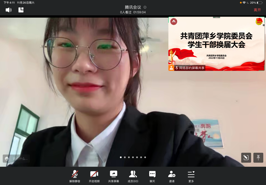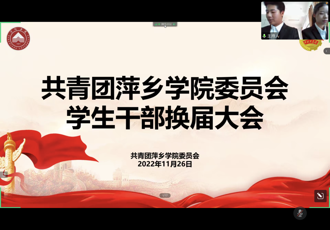 时光如白驹过隙,一闪而逝,又是一年换届时。因疫情防控,共青团萍乡学院委员会采取线上的形式,于11月26日下午,开展了2022届学生干部换届会议。