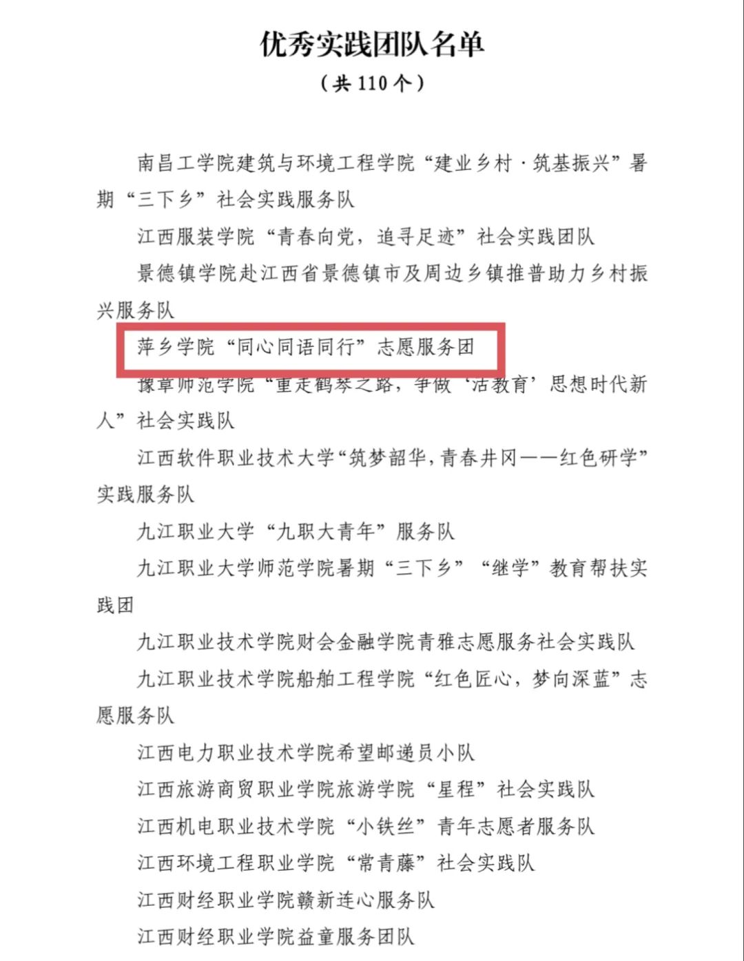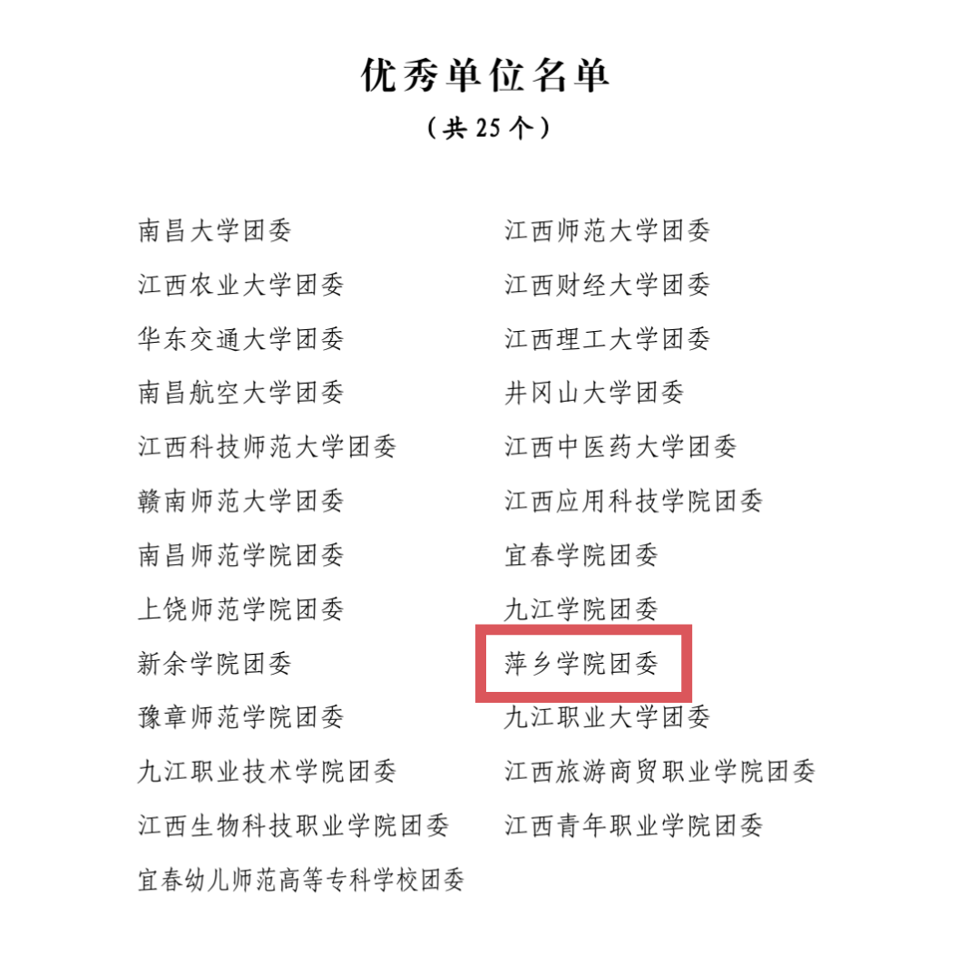 萍乡学院团委荣获2022 年江西省大中专学生志愿者暑期“三下乡”社会实践活动优秀单位。萍乡学院“同心 同语 同行”志愿服务团荣获2022 年江西省大中专学生志愿者暑期“三下乡”社会实践活动优秀实践团队。萍乡学院初等教育学院团委书记欧阳群、2019级本科生王添毅荣获2022 年江西省大中专学生志愿者暑期“三下乡”社会实践活动优秀个人。