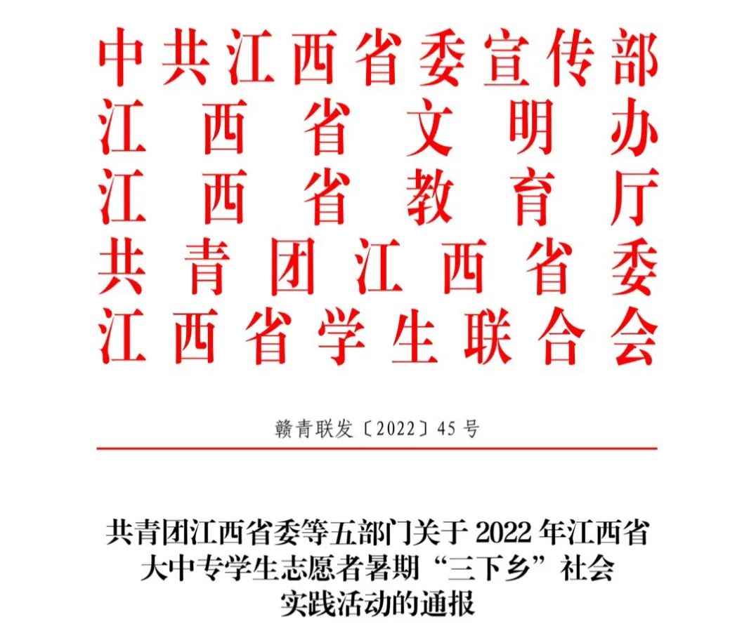 为深入总结经验,做好典型宣传,激励广泛参与,发挥育人实效,2022年12月,省委宣传部、省文明办、省教育厅、团省委、省学联联合下发通知,通报了2022年江西省大中专学生志愿者暑期文化科技卫生“三下乡”社会实践活动获奖情况。