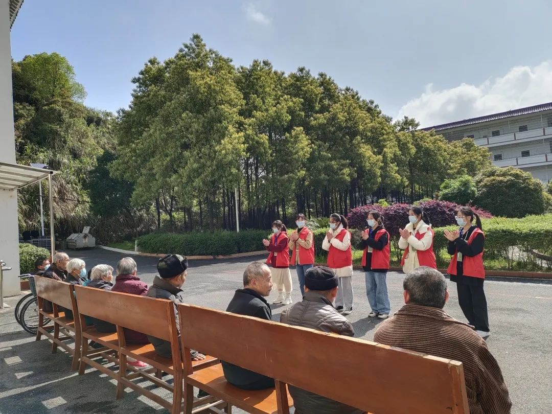 活动开始,志愿者们提着为爷爷奶奶们准备的水果和牛奶走进敬老院,院长对志愿者们的到来表示热烈欢迎。随后,志愿者们合力把屋中的长凳搬到院子里并热情地搀扶着爷爷奶奶们坐下。沐浴在春日的阳光里,老人们摩挲着干瘦的双手,微微笑着,人与景相映成趣。紧接着,志愿者们为老人们表演了精心准备的节目:歌曲独唱《最炫民族风》和《映山红》,歌曲合唱《好运来》和《强军战歌》,以及简单轻松的拍手操。老人们被熟悉的旋律带动,纷纷跟随着节奏哼唱起来,双手在志愿者们的感染下舞动起来,也有的老人们在歌声中忆起了往昔岁月,潸然泪下。