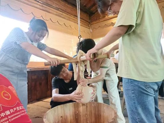 随后,同学们参与到制作手工豆腐环节中,每一个环节同学们都采用纯手工制作,真实地体验了磨黄豆、过滤豆渣以及煮豆浆等全过程。在此过程中,同学们认识到传统手工豆腐的制作艰辛,不同于流水线的机械生产,手工豆腐是匠心独具、细细打磨的,是难得一尝的乡间美味,更是中华民族智慧的结晶,每一个人都应该去品尝、去传承。