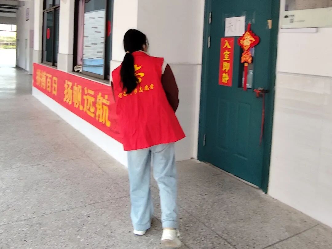 身穿“宁都中学志愿者”红马甲,我正穿梭在高三教学楼的走廊里,对重点场所进行定时定点的值班巡逻。此刻,我驻足在高三(42)班的门口,仔细查看门窗与环境安全。作为办公室值班人员,校园的每一处角落都是我们的责任阵地——从教学楼到礼璧楼,从图书馆到食堂公寓,我们用脚步丈量平安,用细心守护秩序。