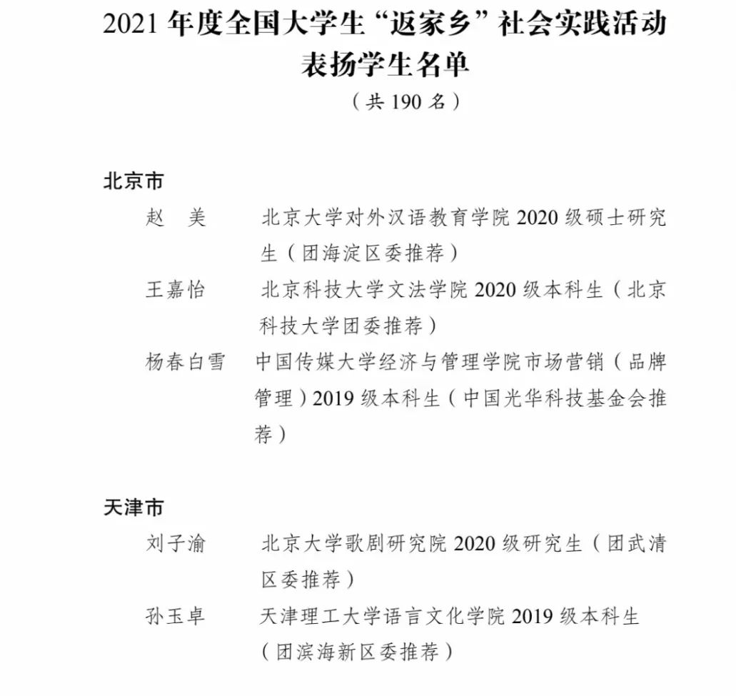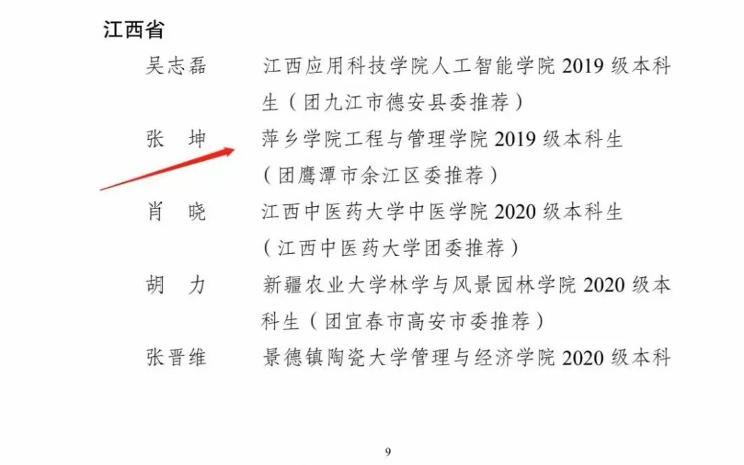 共青团中央青年发展部对2021年度全国大学生“返家乡”社会实践活动总结通报结果公示, 萍乡学院工程与管理学院 2019 级本科生张坤获得“2021 年度全国大学生‘返家乡’社会实践活动表扬学生”荣誉称号(全国共 190 名)。