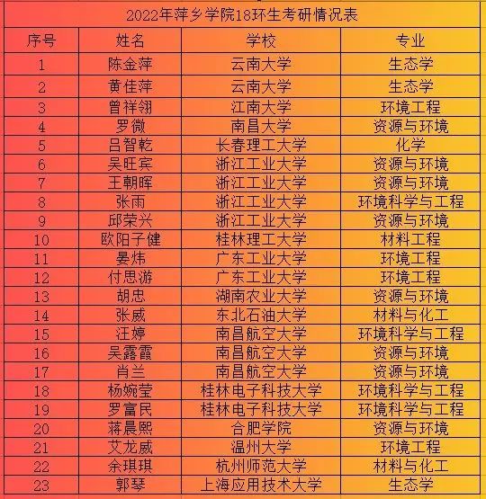 2022年考研上线24人,录取23人,录取率高达56.1%,是萍乡学院有史以来考研率最高的班级,也是环境生态工程专业首届毕业班级,他们开创了辉煌的先河,为下一届环生学子起到了榜样的作用。
