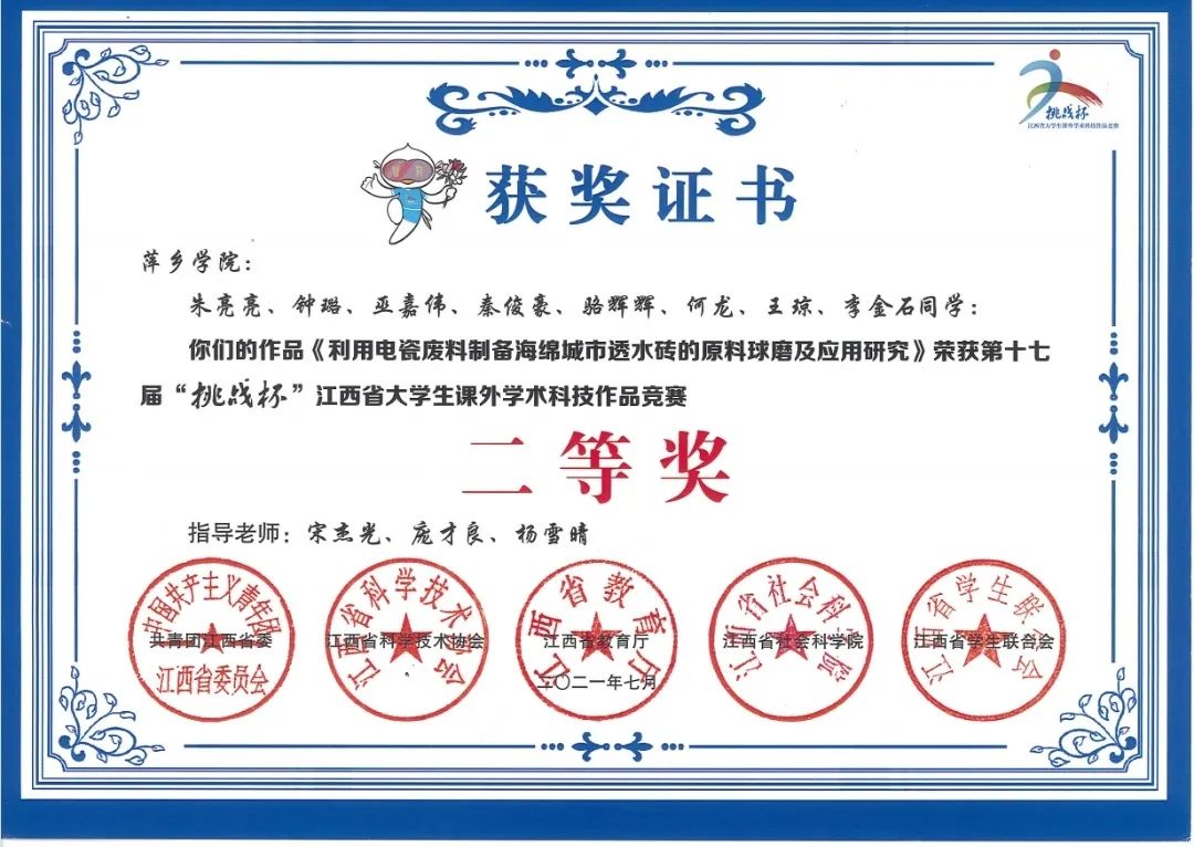 2021年7月在第十七届“挑战杯”江西省大学生课外学术作品竞赛荣获“二等奖”