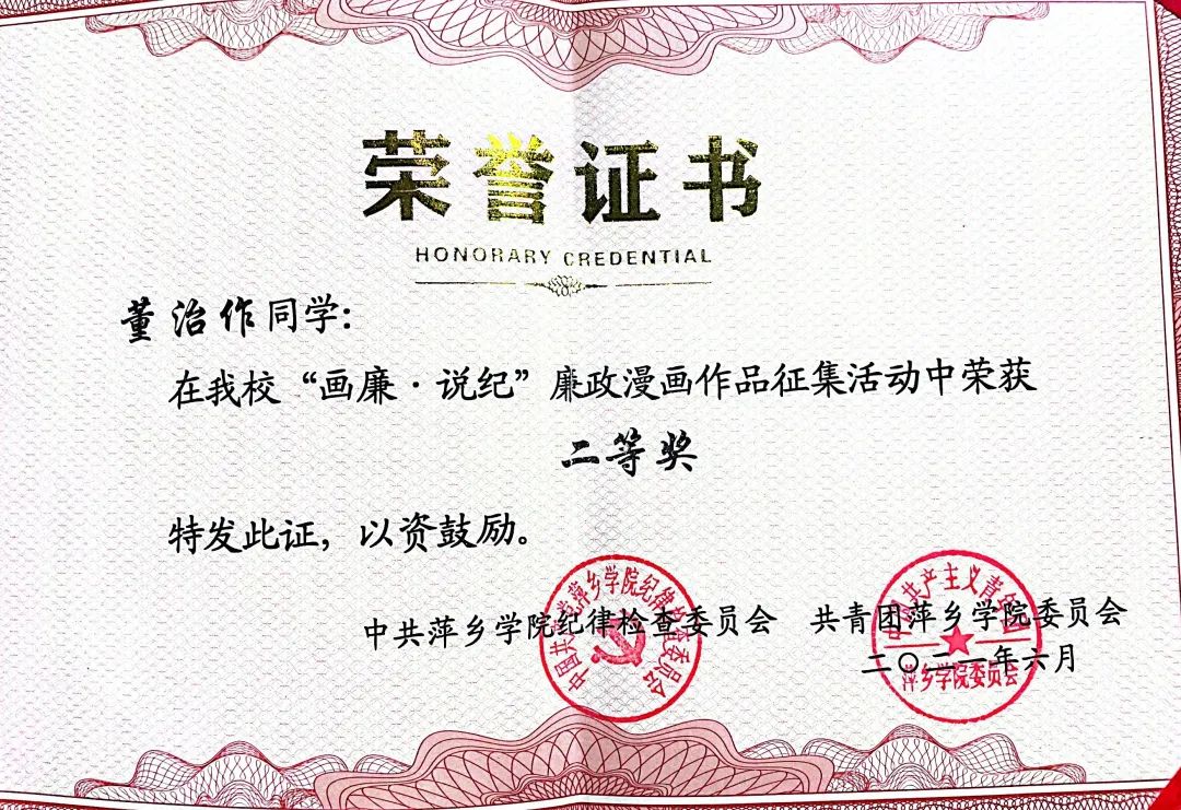 2021年6月 在萍乡学院“画廉•说纪”比赛中荣获二等奖
