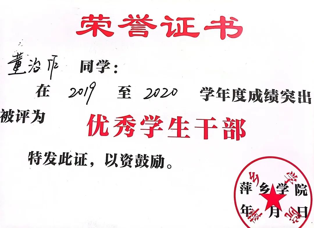 2020年10月 被萍乡学院评为“优秀学生干部”