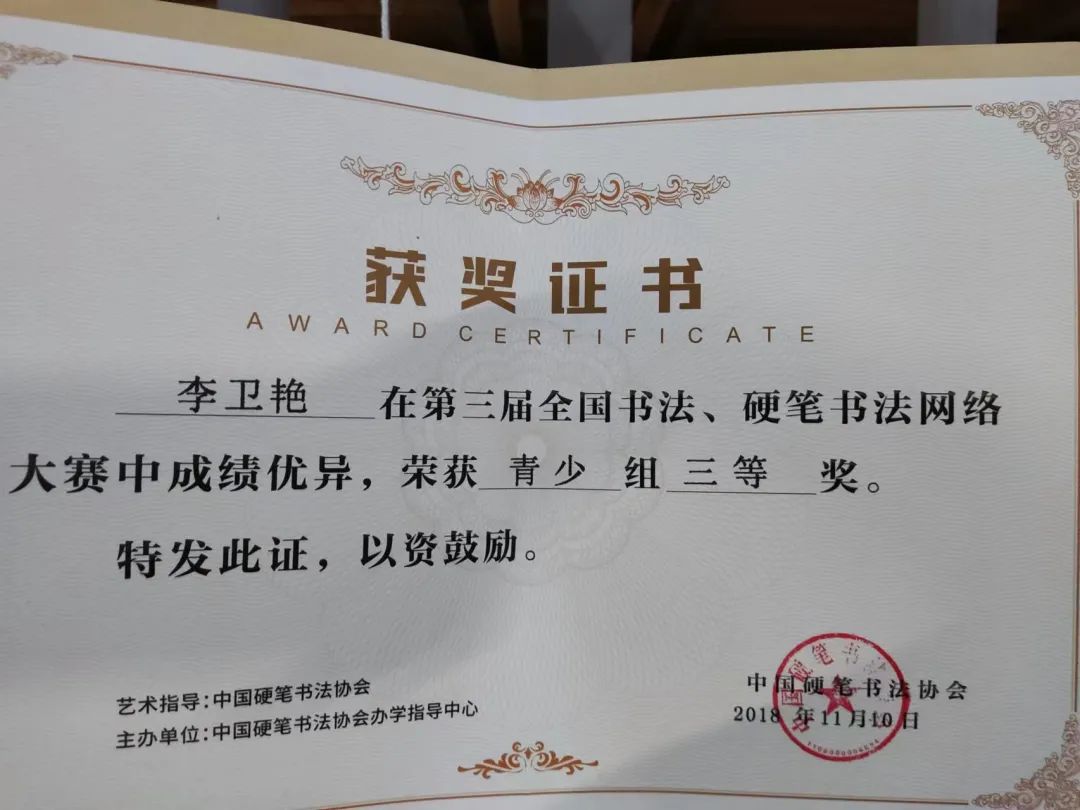 第三届全国书法、硬笔书法网络大赛荣获青少组三等奖
