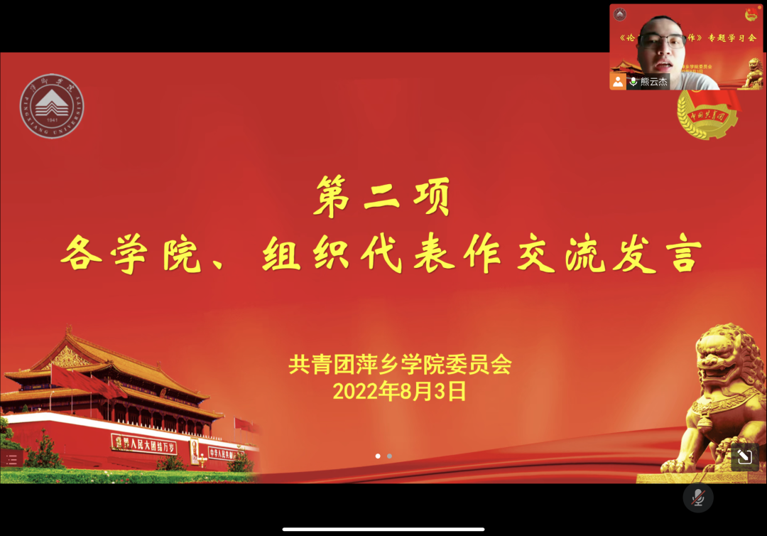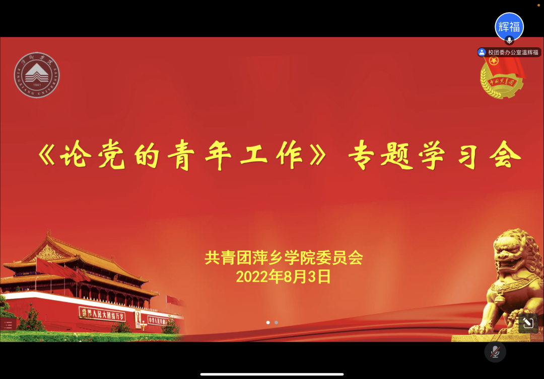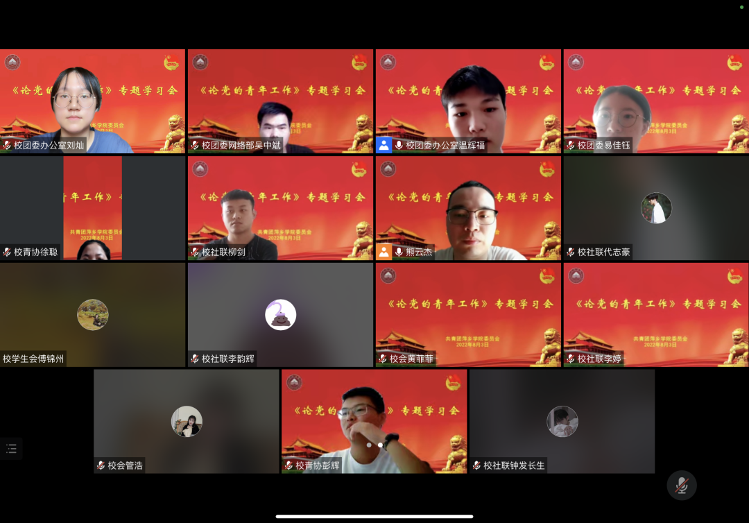 深入学习宣传贯彻习近平总书记《论党的青年工作》是当前和今后一个时期的重大政治任务。为推动新时代党的青年工作取得更大成效,8月3日上午,萍乡学院团委通过线上会议形式,开展了《论党的青年工作》专题学习会。校团委副书记熊云杰和部分校级组织学生代表参加此次学习会,会议由校团委副书记熊云杰主持。